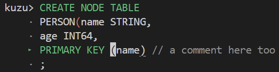 lbug> :multilineMulti line mode enabledlbug> CREATE NODE TABLE · Person(name STRING, · age INT64, ‣ PRIMARY KEY (name) // a comment here too · );The ‣ symbol indicates the current line.