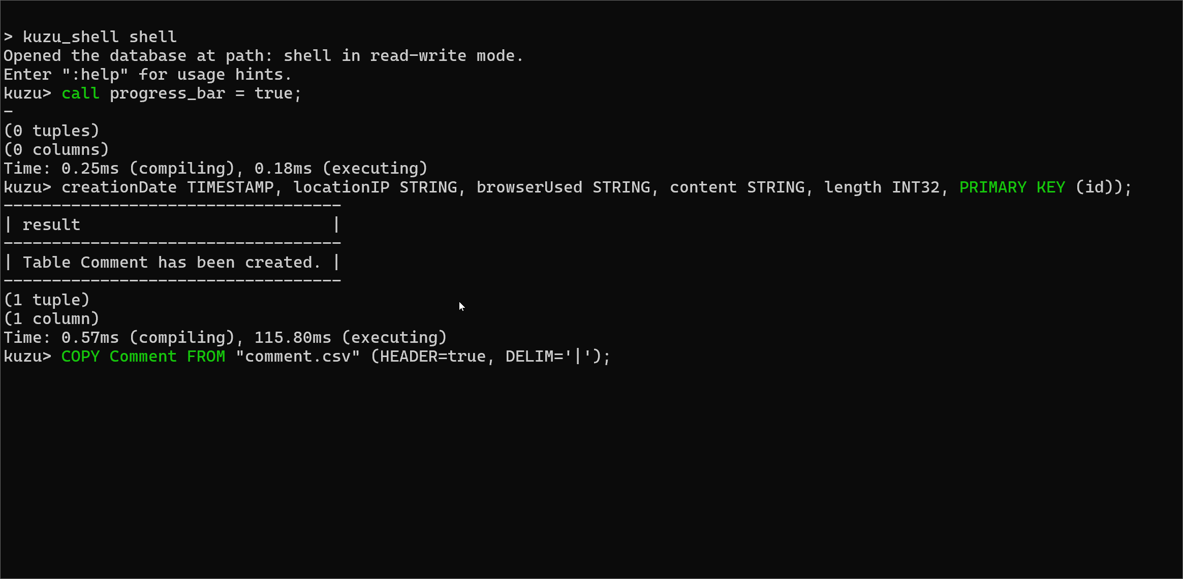 lbug example.lbug < schema.cypherOpened the database example.lbug in read-write mode.Enter ":help" for usage hints.┌────────────────────────────────┐│ result ││ STRING │├────────────────────────────────┤│ Table Person has been created. │└────────────────────────────────┘(1 tuple)(1 column)Time: 0.04ms (compiling), 0.82ms (executing)┌────────────────────────────────────────────────┐│ result ││ STRING │├────────────────────────────────────────────────┤│ 4 tuples have been copied to the Person table. │└────────────────────────────────────────────────┘(1 tuple)(1 column)Time: 0.09ms (compiling), 11.75ms (executing)Query progress