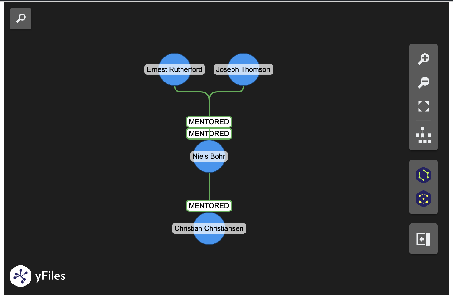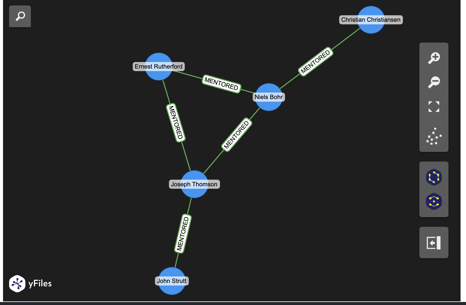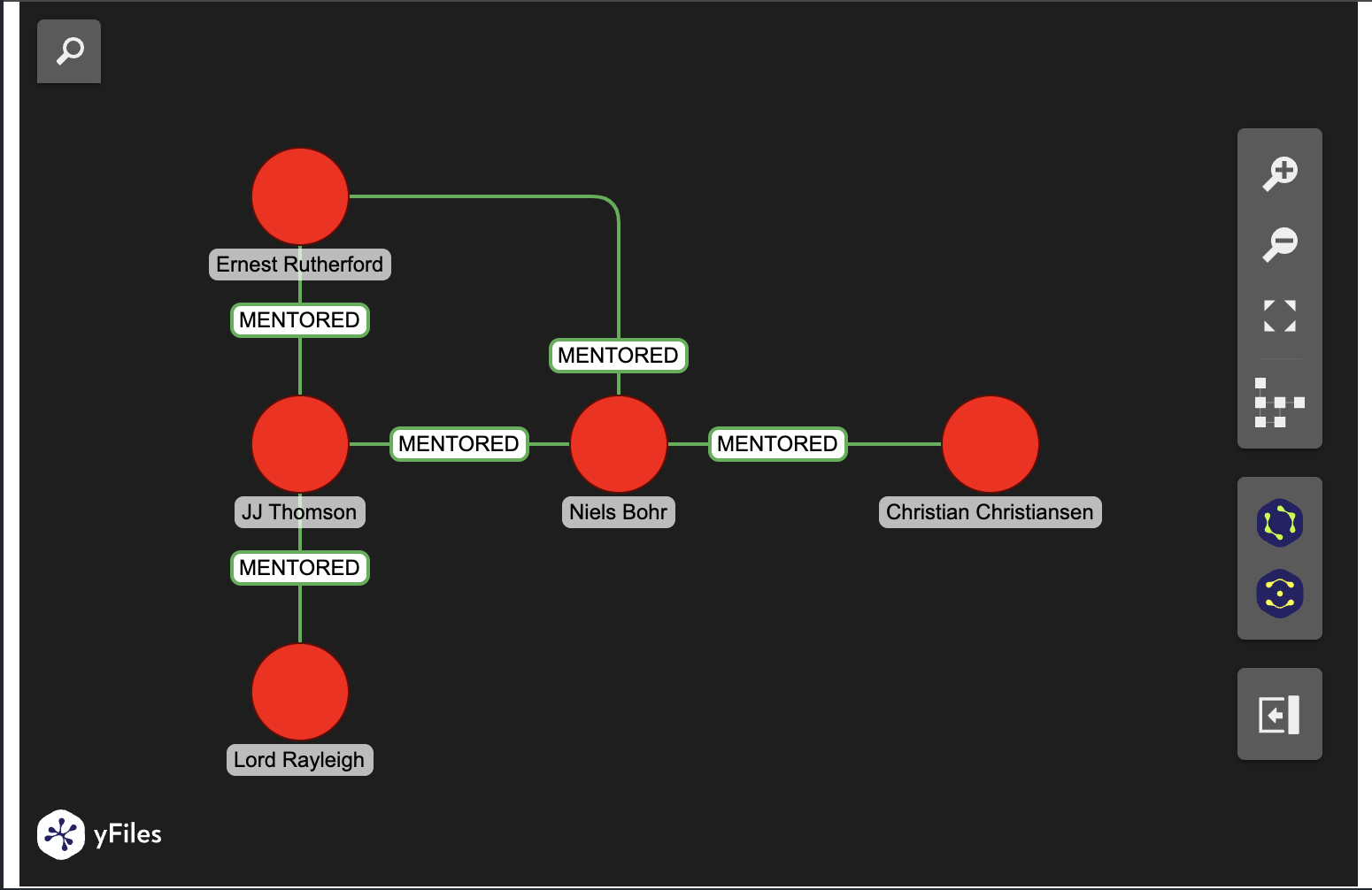 import real_ladybug as lbfrom yfiles_jupyter_graphs_for_kuzu import LadybugGraphWidget# Open a new in-memory databasedb = lb.Database(":memory:")conn = lb.Connection(db)# Create tablesconn.execute("CREATE NODE TABLE Person(name STRING PRIMARY KEY, alias STRING)")conn.execute("CREATE REL TABLE MENTORED(FROM Person TO Person)")# Insert dataconn.execute(""" MERGE (a:Person {name: "John Strutt", alias: "Lord Rayleigh"}) MERGE (b:Person {name: "Joseph Thomson", alias: "JJ Thomson"}) MERGE (c:Person {name: "Ernest Rutherford", alias: "Ernest Rutherford"}) MERGE (d:Person {name: "Niels Bohr", alias: "Niels Bohr"}) MERGE (e:Person {name: "Christian Christiansen", alias: "Christian Christiansen"}) MERGE (a)-[:MENTORED]->(b) MERGE (b)-[:MENTORED]->(c) MERGE (b)-[:MENTORED]->(d) MERGE (c)-[:MENTORED]->(d) MERGE (d)-[:MENTORED]->(e)""")Display graph with default layout